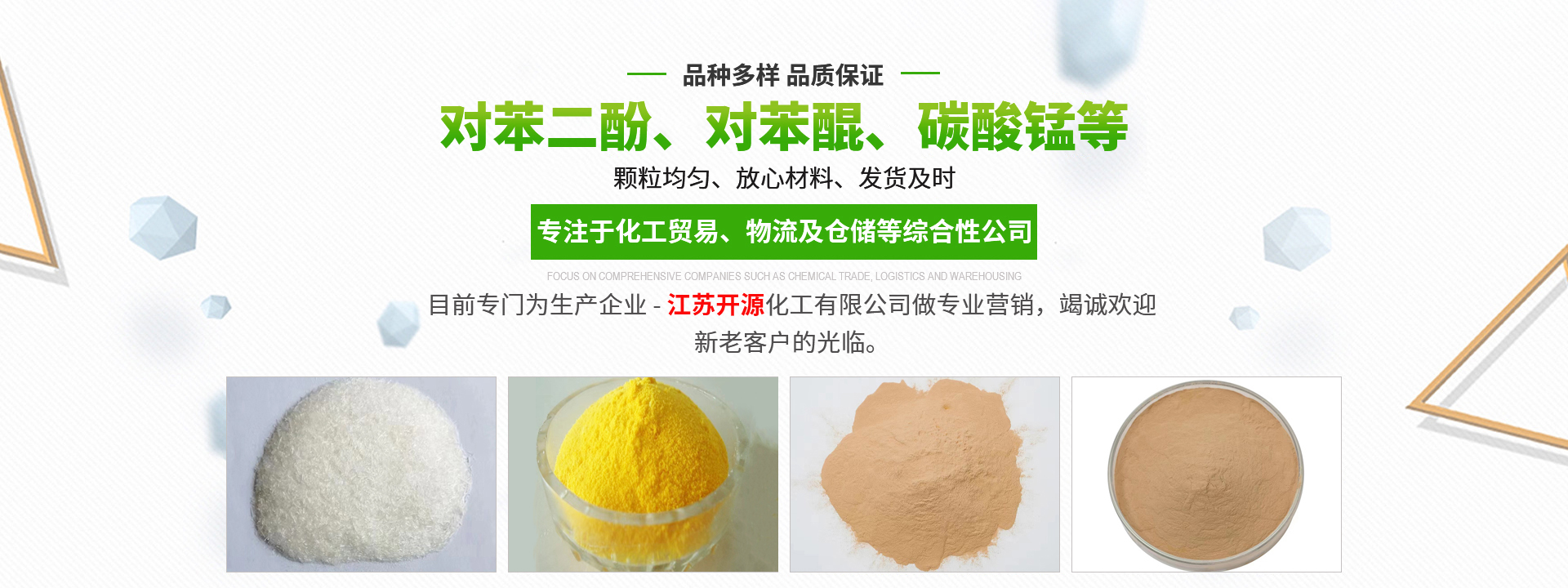 江苏利生化工有限公司是一家专注于化工贸易、物流及仓储等综合性公司(是中石化和中石油供应商),成立于2008年6月,注册资本1000万。目前专门为生产企业 - 江苏开源化工有限公司做专业营销,竭诚欢迎新老客户的光临。公司主导产品有吩噻嗪、丙三醇、对苯二酚、对苯醌、碳酸锰等。